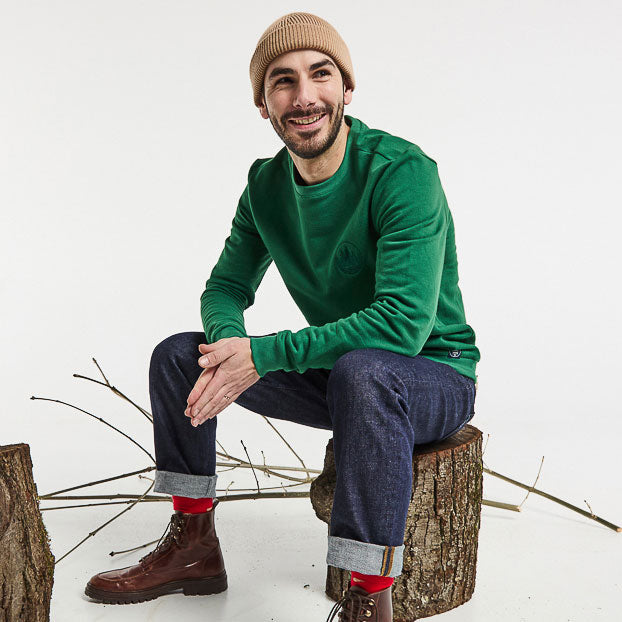 Pull homme en coton biologique, fabriqué en France par La Gentle Factory. Son intérieur molletonné apporte confort et chaleur, tandis que la broderie forêt ton sur ton sur la poitrine ajoute une touche d’élégance discrète.